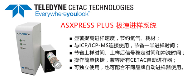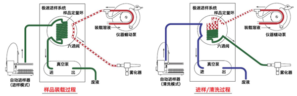 較之傳統(tǒng)進(jìn)樣過程,ASXPRESS PLUS極速進(jìn)樣系統(tǒng)提速流程如上,待測樣品繞過低速蠕動(dòng)泵被高速引入到霧化器前端處于待命狀態(tài),通過內(nèi)置的六通閥切換不同流路,使空白及不同待測樣循環(huán)進(jìn)入霧化器,管路清洗單方面自動(dòng)完成,有效節(jié)省進(jìn)樣時(shí)間、進(jìn)樣后信號(hào)穩(wěn)定時(shí)間和沖洗時(shí)間,顯著提高進(jìn)樣速度并節(jié)省氬氣。同時(shí),系統(tǒng)兼容多種類型自動(dòng)進(jìn)樣器,搭配使用更能事半功倍,適用于ICP-OES或ICP-MS。