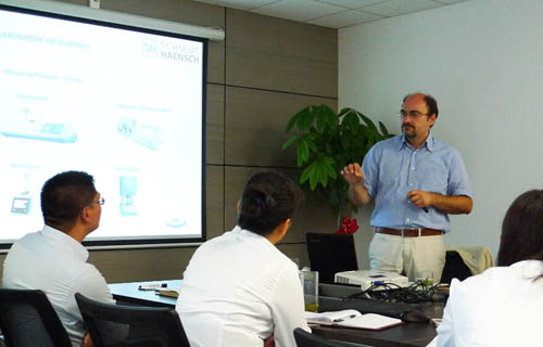 2014年9月22日,適逢慕尼黑上海生化分析展開(kāi)展前夕,德國(guó)SCHMIDT+HAENSCH(施密特-漢熙,簡(jiǎn)稱S+H)公司產(chǎn)品經(jīng)理Nebojsa Francuski來(lái)到利曼中國(guó)上海辦,為利曼的銷售精英們進(jìn)行了系統(tǒng)的產(chǎn)品培訓(xùn)。