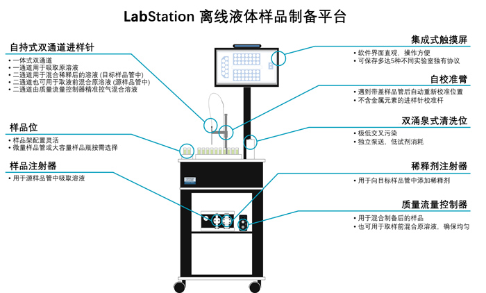 基于成熟的自動(dòng)化技術(shù)及優(yōu)化改進(jìn)的處理流程,LabStation集成移動(dòng)柜、觸摸屏、防污外殼等模塊,實(shí)現(xiàn)自動(dòng)稀釋、酸化、內(nèi)標(biāo)添加、樣品混合、標(biāo)曲配制、樣品管清洗等功能。